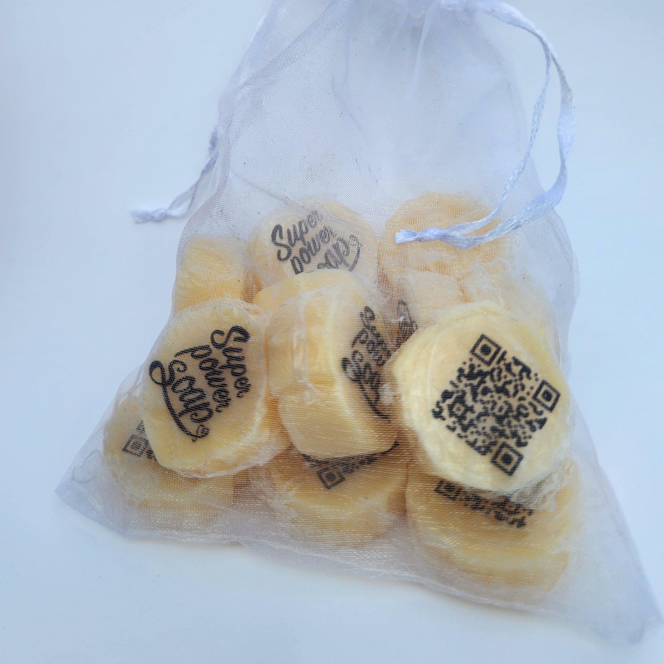A bulk event favor set including 20 organza bags, each filled with 12 nickel-sized mini rose soaps. Designed for corporate events, pop-ups, referral campaigns, and high-volume distribution.